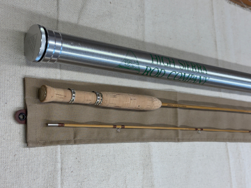 (Available at the Virginia Lakes Resort, Virginia Lakes, California or direct from us) This is one of our new Trout Scout model rods. It's a hollowed, pentagonal version of our discontinued Trout Scout hexaonal rods that is available. It is a model S7614-5, serial #2124, a 7'6" 2 piece fly rod for a 4/5 weight line. It is natural blond in color, with nickel silver ferrules and down-locking reel-seat hardware, and a beautiful Cocobolo wood reel-seat insert, with red silk wraps and a 6" tapered grip. The butt cap has our logo engraved on it. It has a semi-gloss finish and is very similar to our Signature models but more affordable. It has a medium/fast action and is perfect for streams and lakes, a good all-round rod, and is very popular with guides. Click on the image for a more detailed view. This rod is available now for $899.99. As all our rods, it comes in a high quality aluminum rod tube with our logo and a quality cloth bag.
